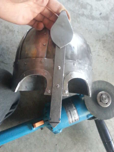 Ahora que se corte el ojo pude tirar un relleno temporal para tener una idea de cómo el casco sería sentarse y decidir dónde cortar la nasal. Usé una escuadra de combinación para marcar 2 ángulos de 45 grados y corte la nasal hasta un punto, también hizo 2 cortes pequeños por encima del punto. Ésos son sólo porque pensé que parecían agradables.