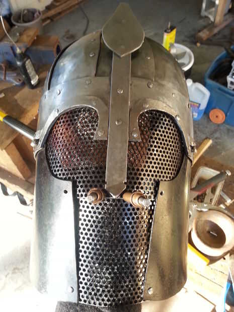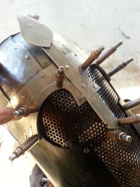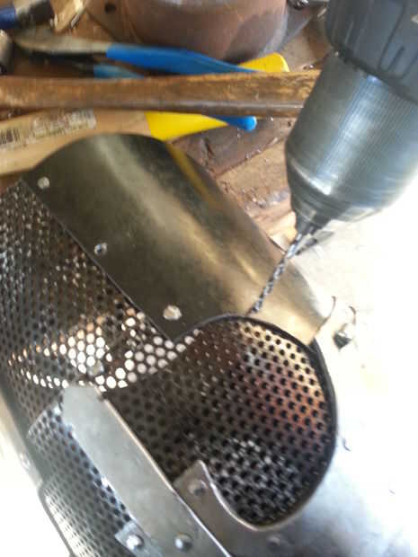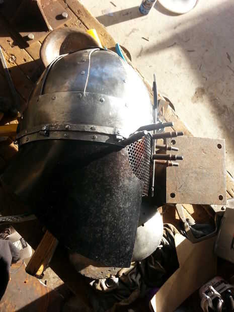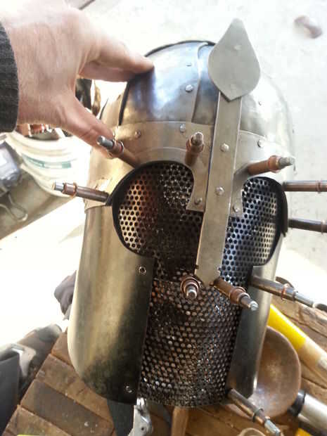 Empecé con las cejas cerca la nasal entonces trabajado mi manera hacia fuera. Una vez que llegué a la placa de abrigo comencé en la parte inferior y llegó hasta los puntos de las mejillas entonces hicieron las por la nasal. Después de ésos en regresó y taladrar los agujeros para los remaches intermedios restantes y para la buena medida acabé poniendo un par en la nasal así.