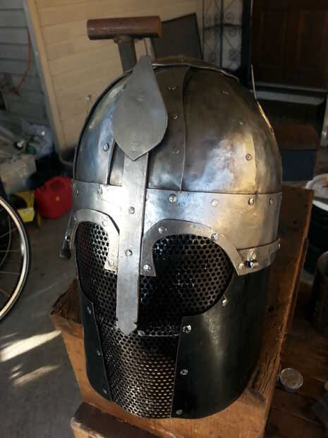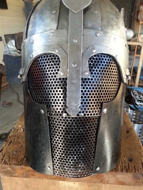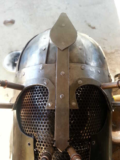 Ya he añadido el extra debajo de la barbilla estaba siendo capaz de usar la mitad inferior. Me limpió el borde cortado, curvas más o menos a la forma y colocarlo en lugar. En esta placa empecé poniendo en 2 clecos a cada lado de la nasal para mantener mi traslapo mínimo en el lugar. A continuación ajustar las esquinas inferiores de las placas de la mejilla. Era porque tenía que tirar de la barbilla hacia adentro para empujar la parte superior las esquinas hasta hasta que se recogió por los remaches en la base de la pieza superior. Una vez que los agujeros de remache superior suficiente superposición para trabajar con estaba listo para comenzar a clavar.