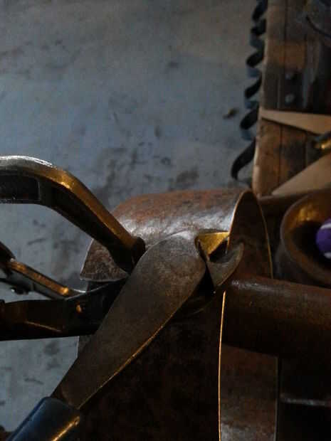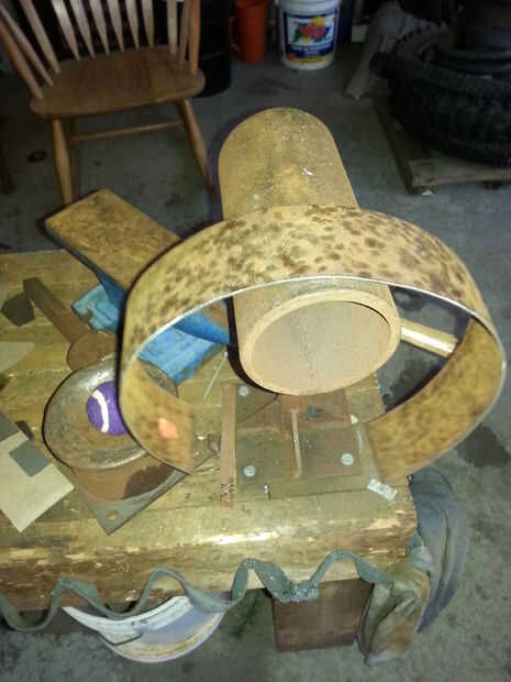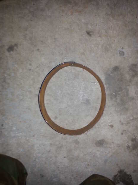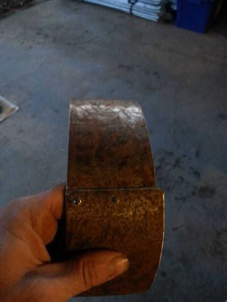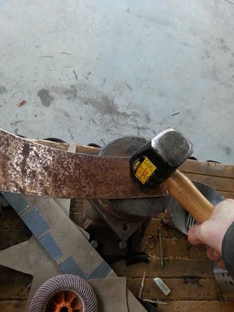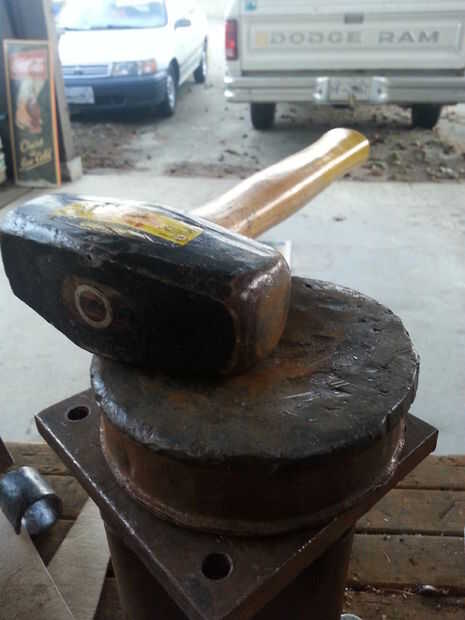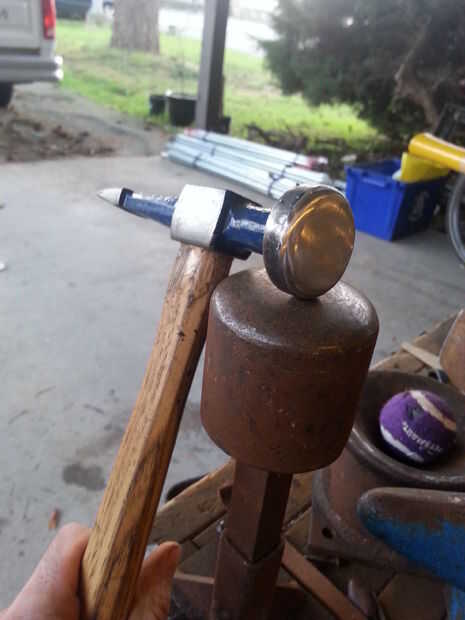 Después aplanando usé un mazo de goma y trabajó alrededor de un 4" T juego hasta parecía áspero en forma de la cabeza. Luego pasa encima a una estaca de 1-1/2" T. Encontrar el más pequeño diámetro útil para tine tuning el traslapo, también es un juego más sólido y mejor adaptado a clavar en.