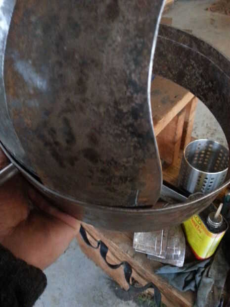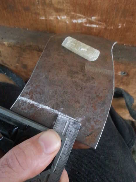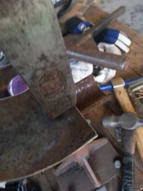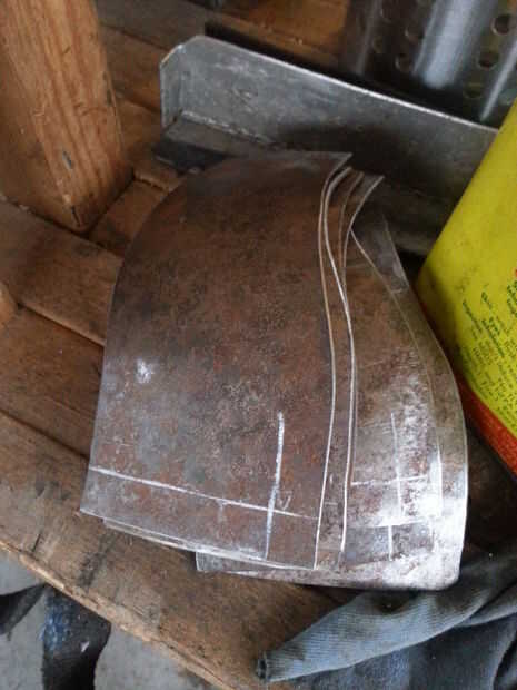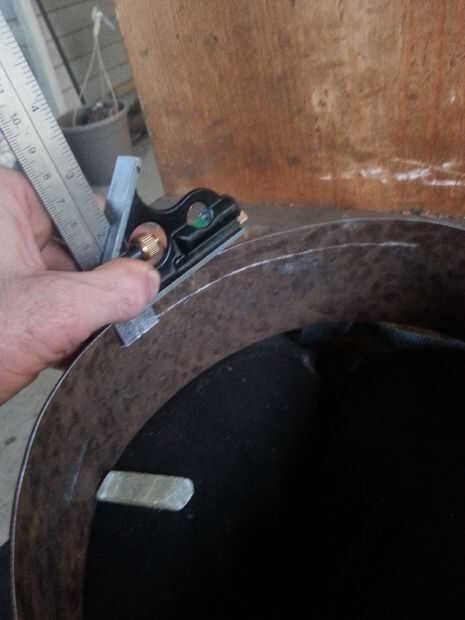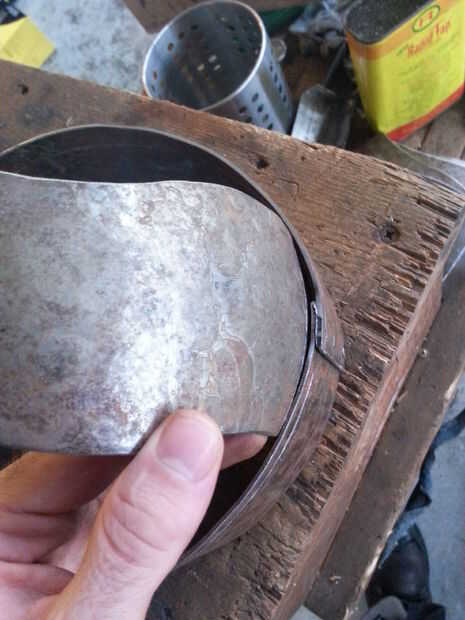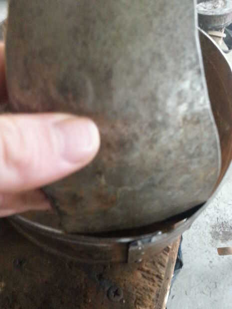 Comencé en la parte posteriora en la costura, alineados a las líneas y comentar que el centro. Para emparejar las curvas utilicé una estaca con un canal para la parte superior y un martillo con una cara que empareja. Llamativa la zona entre los lados del canal facilita ajustar el radio de la curva para que coincida con la banda de la frente. Reforzado mis curvas un poco más de un lado para hacer espacio para deslizar en la placa siguiente.
