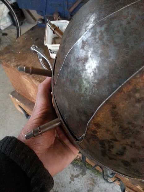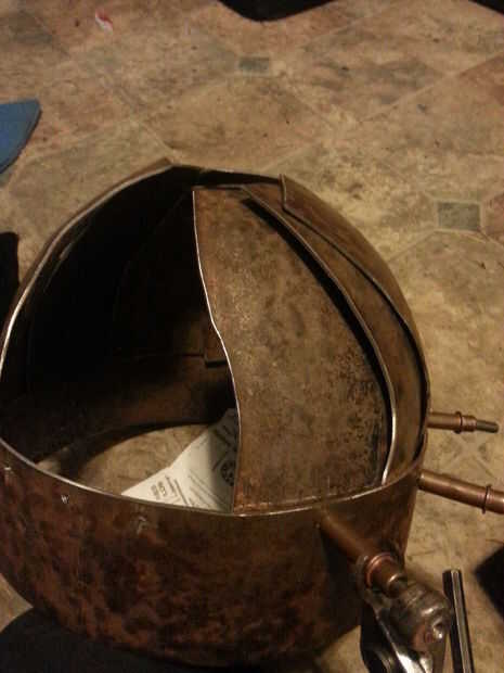 Cuando era feliz con el ajuste de cada placa perforó un agujero de 1/4" abajo la banda de la ceja, a lo largo de la línea central de la placa y poner en un Leco para sostenerla en lugar. Pequeños tornillos y tuercas funcionará igual de bien. Como trabajé alrededor el casco he encontrado que la superposición empujan la parte superior del casco como una escalera de caracol. Rápidamente me di cuenta de que no iba a ser capaz de hacer cosas en su lugar sin necesidad de piezas remachadas sólido.