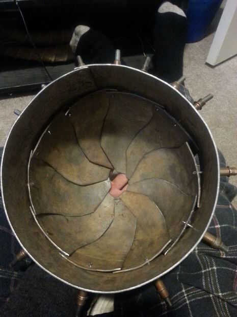 Esta vez alrededor, ninguna escasez de jurar, logré obtener el cráneo entero encajan más o menos. Donde piezas estaban sentados también perforé los agujeros de remache para el panel superposiciones ayudar a mantener las cosas en su lugar. Taladré los 1/4" abajo la banda de frente y aproximadamente 1/8" en desde el borde del panel exterior.