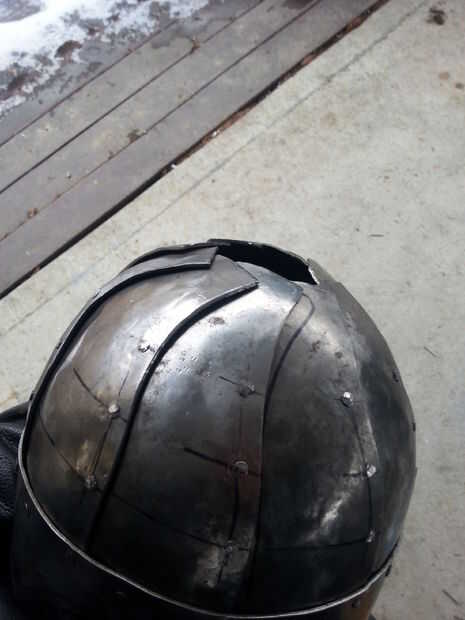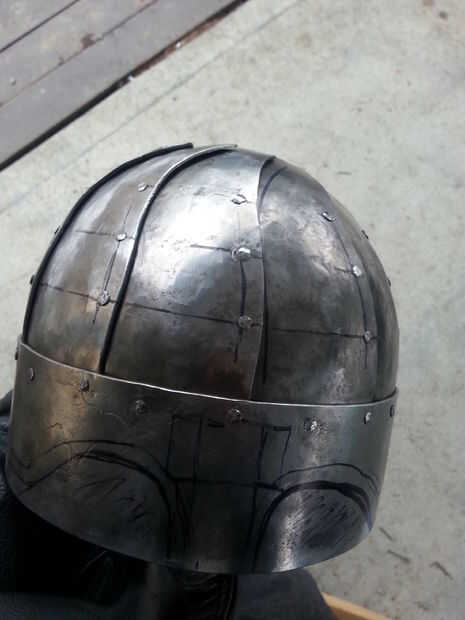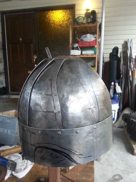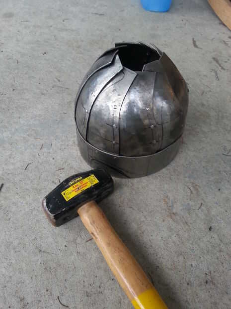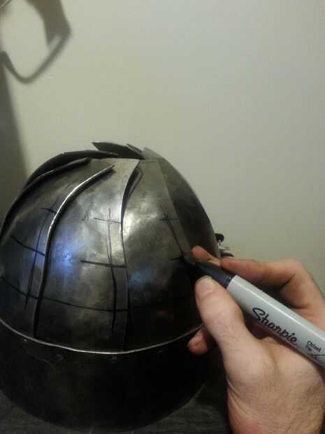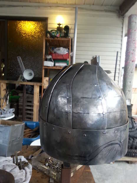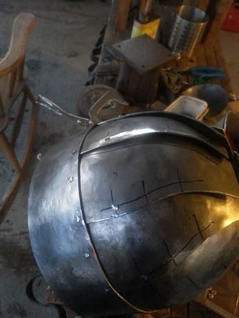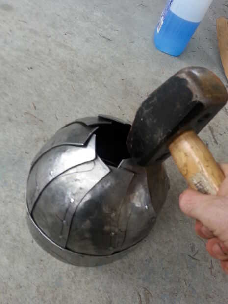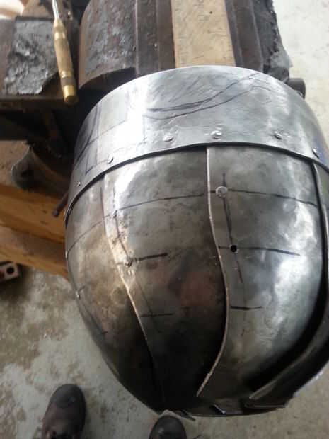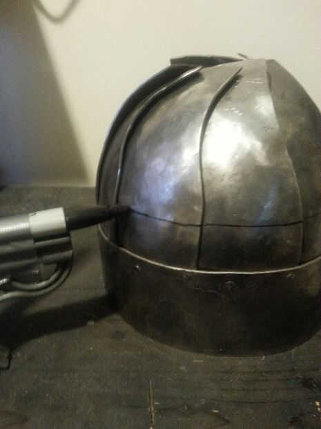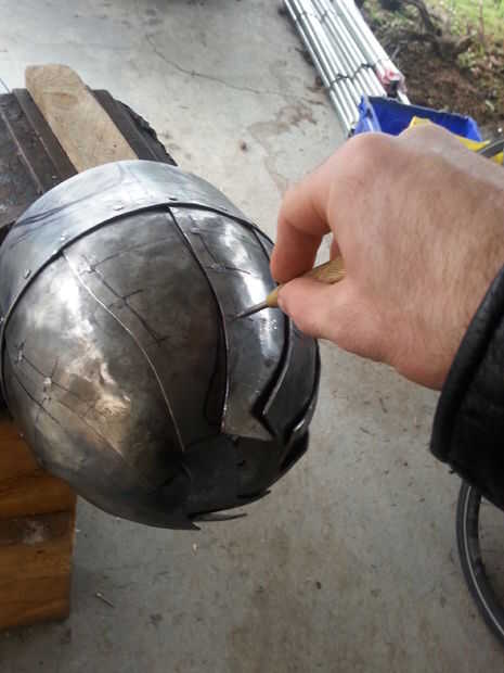 Ahora que todas las placas de cráneo son remachadas a la banda de la frente es el momento para ajustar la forma del cráneo y remache de todos juntos.