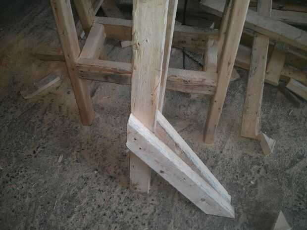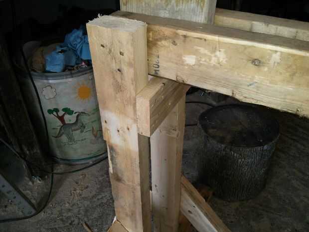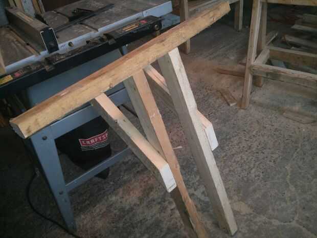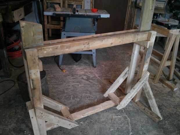 Las patas están construidas totalmente de placas de corte bruto 2 x 3" y están todos clavados juntos. Cada pata está construido con dos postes verticales que unen la cama del torno, una base de 36-48", dos tableros de 21" con cortes de 45 grados para actuar como soporte estructural de ancho y dos más 21" tablas para actuar como soporte estructural de longitud. Entre cada juego de piernas es una viga de corte a 48". Ahora debido a las diferencias de espacio, en su mayoría causadas por los diferentes espesores de crudo cortado 2 x 3" tablas y las tablas fresadas de la cama del torno, tuve un momento difícil conseguir las juntas estructurales alineadas correctamente, así como se puede ver, compensó clavado en el exterior, de las verticales, luego uniéndolas a una tabla corta de 7" que se encuentra en el travesaño. Es un poco fuera de norma, pero funcionó bastante bien y acabé bastante estable. Por último, corté un par de 2 x 3 x 7" pedazos y clavado debajo de la cama del torno para soporte adicional.