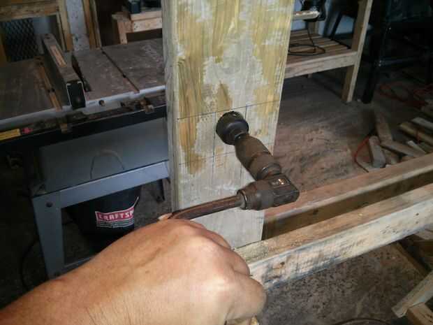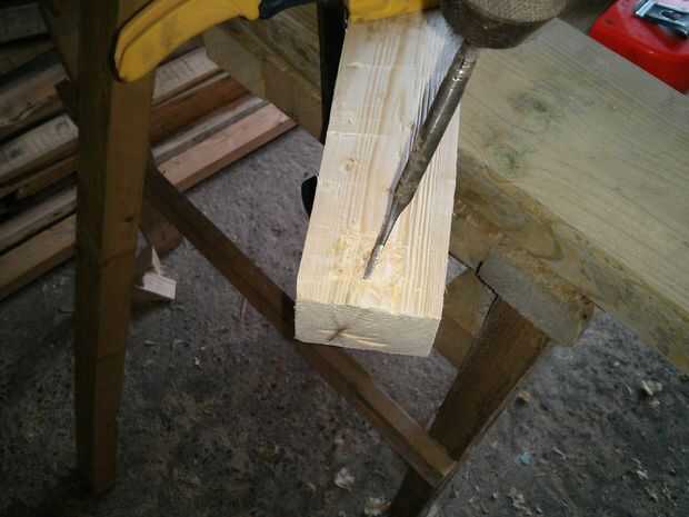 Para empezar a configurar mi apoyo en el caballo de afeitado y afilado el pasado de 4.5", luego perforé un orificio de 1" al final. Luego marqué hacia fuera de la mortaja en el cabezal, donde quería el apoyo para sentarse. Para los míos, sabía que estaría utilizando un resto de herramienta que era 3" de espesor, así que puse la mortaja 3" por debajo del eje. Entonces usé mi taladro de tirante y poco con una sierra para quitar el peso del material, luego un afilado cincel y un martillo al cuadrado.