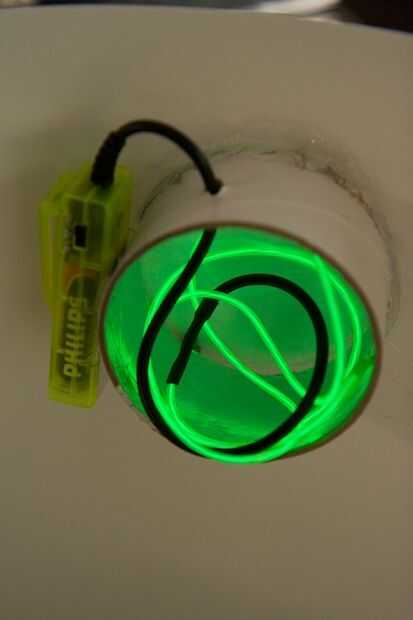Entonces tomó un tubo de cartel y cortar el papel para caber dentro de él. Corte una sección de 3" del tubo y había cubierto el interior con papel de plata. Hice lo mismo para la tapa del extremo. Luego perforó un agujero a través de 3' de alambre verde y caliente había pegado a la batería al lado de él.