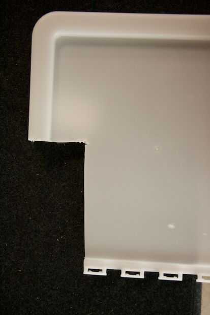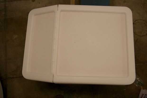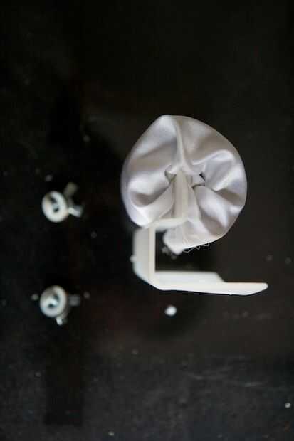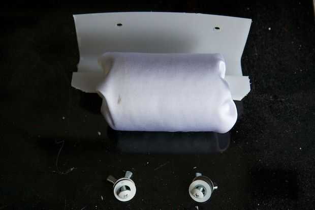 Para que sea trabajo, comenzamos con una tapa de plástico de un contenedor de IKEA, y usando un Skil Sierra, corta dos alas atornilladas en el interior de la can, por encima de los agujeros del brazo. Otra cosa importante aquí era poco de espuma (que cubrimos con tela) y fijarlo a las alas donde descansan sobre los hombros. Atamos a la tela a la espuma y luego a las alas con pegamento caliente, pero se utilizaron dos tornillos y arandelas para sujetar cada ala a la lata.