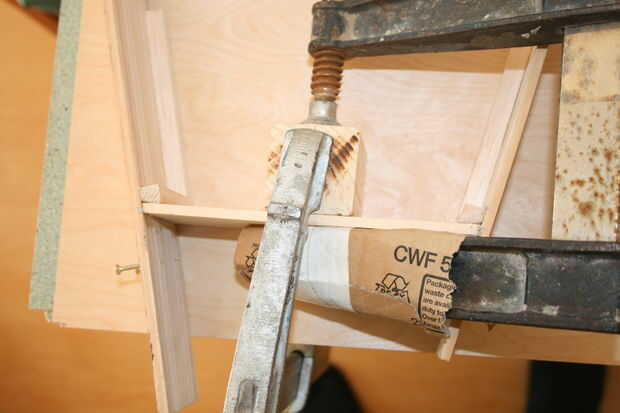 Al principio tienes que añadir un bloque de apoyo de madera, que más tarde llevará a cabo el cuello. tienes que cortar el bloque muy precisamente. Debe tocar ambos, portada y contraportada, así que cortar exactamente la altura por lo que se ajusta perfectamente en el Uke.