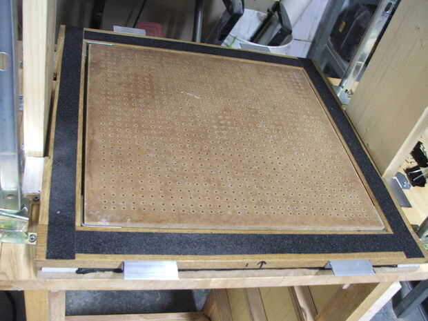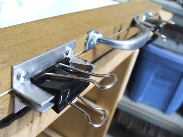 Para unir los dos cuadros, he utilizado trocitos de aluminio que l-canal atornillado en el marco superior e inferior. Estos se pellizcan junto con un clip binder para mantener el plástico en su lugar. Un par de asas a ambos lados de la estructura superior hace mover esto hacia arriba y hacia abajo en la máquina mucho más fácil. (foto 5)
