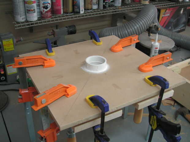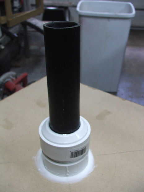 En primer lugar, debe determinar cuáles serán su eventual fuente de vacío. Un viaje a la tienda de mejoras para el hogar de caja grande local debe proveer una selección de accesorios de tubería que se pueden acoplar a la manguera de vacío (foto 3). Elegí una gran rosca PVC montaje para que pudiera cambiar a la fuente de vacío más adelante si lo desea. Cortar un agujero en el centro de su base y encolar la tubería deseada en su lugar con adhesivo hermético. (foto 2)