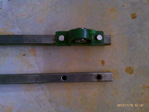 En primer lugar, línea de orientarte y ponga el extremo de uno 1-1.5" desde el borde (Estoy suponiendo ambas piezas de tubo cuadrado son exactamente los mismos) y se alinean en el centro del tubo. Marque los agujeros para empernar el rodamiento en. Mis rodamientos tienen orificios de 3/8", así que hice agujeros de 1/2" con mi taladro. Una vez haya realizado el primer conjunto de agujeros (Asegúrese de que usted vaya a través del tubo), un poco más grande, o una lima redonda y elimine las rebabas de los agujeros. Siempre debe elimine las rebabas agujeros para asegurarse de que sus tornillos, arandelas, etc. sentarse a ras con la superficie que está trabajando en y también porque las fresas eventualmente se rompen y será probable moho, o meterse en cosas que no quieras. Para elimine las rebabas, sólo ponen poco más grande y colocarlo sobre el agujero y girar a mano. Debe suavizar los bordes de cada agujero.