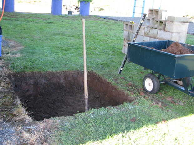 La Fundación: Inició el proyecto ubicando el horno lo suficientemente lejos del pórtico de seguridad pero lo suficientemente cerca para mayor comodidad. Cavaron un agujero cuadrado 54" ancho y unos 6" por debajo de la línea de escarcha y me destruyó el agujero. En este agujero cuadrado me lleno nivel aproximadamente 4" de 5/8" menos grava.