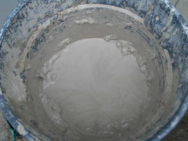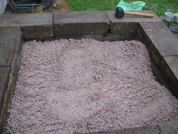 Resultando 12" vacío se rellena con una mezcla aislante de Deslice aserrín, perlita y arcilla. Cantidades iguales de aserrín y perlita se midieron cuidadosamente por la pala llena en una carretilla. Deslizamiento de la arcilla, arcilla mezclada con agua a una consistencia de crema agria, fue agregado hasta que todas las partículas estaban recubiertas con arcilla. Una bola rugosa de la mezcla de aislamiento no salpiquen ni romperán cuando se deja caer desde la altura de la cintura. Esta capa de aislamiento fue embalada y nivelada.