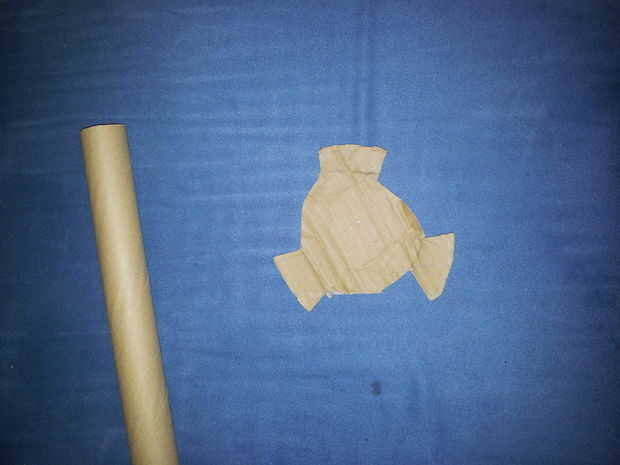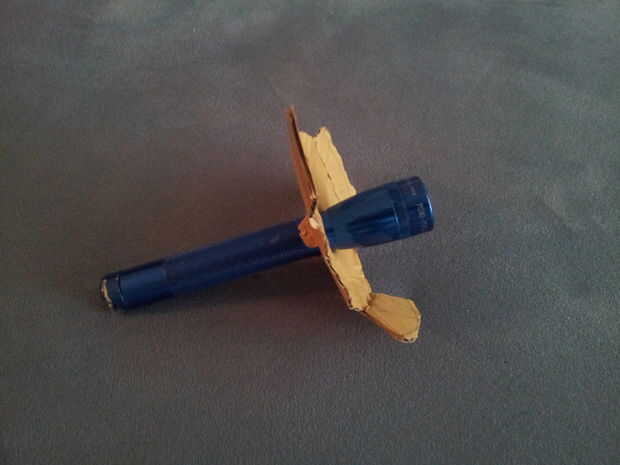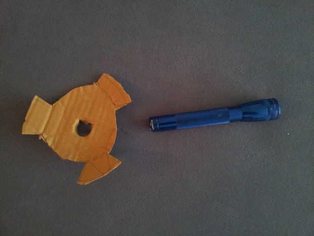 Primero tienes que medir el diámetro de unos 3-4 centímetros dentro de la abertura (más grande) del cuerpo de la antorcha. Garabatear un círculo con este diámetro en la cartulina y añadir las aletas de 3-4 (el número de las aletas depende del tamaño del diámetro y el peso de la fuente de luz (en mi caso 3 eran bastantes).