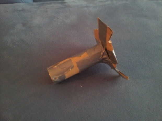 Luego cortar la forma resultante con la tijera y reforzar la pieza con cinta adhesiva. Es una buena idea primero doblar las aletas a 90 grados y el conducto-taping el refuerzo.
