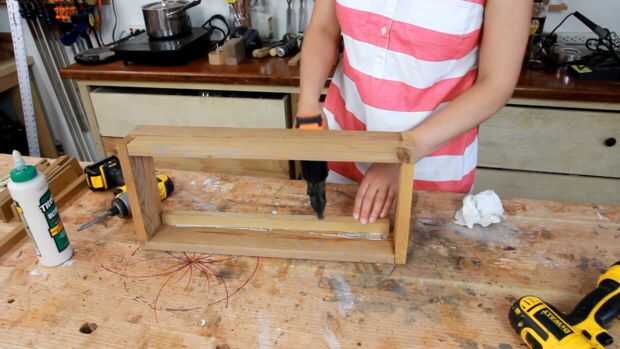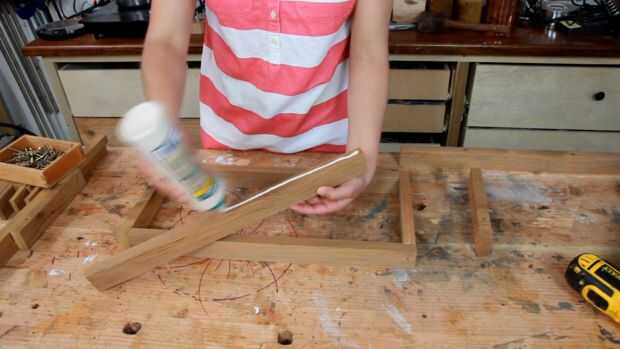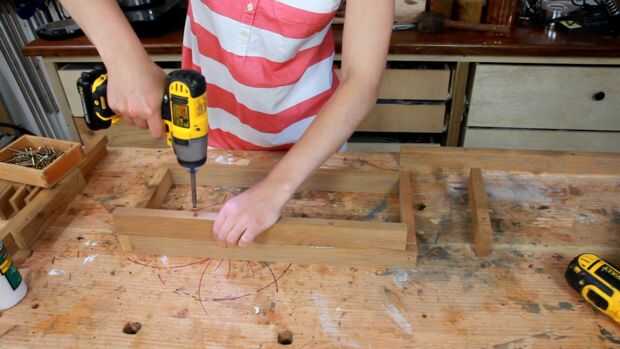Una vez que el cuadro básico completo pegamento y clavo en la madera de apoyo, corte B. Esto es lo que descansará sobre los listones. Por último, pegamento y grapas hacia abajo de los listones - corte D y distribuirlos uniformemente.