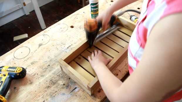 Con un poco de avellanado, perfore previamente las tablas que va estar en la parte inferior - dos cortan A y dos cortan C. Luego pegar y engrape el primer nivel, asegurándose de Escalonar la madera. Estoy usando pegamento hecho de maderas aceitosas, ya que estoy construyendo con cedro. A continuación, pegue en el siguiente nivel y taladro conecta los dos niveles con tornillos. Se trata de la parte inferior.