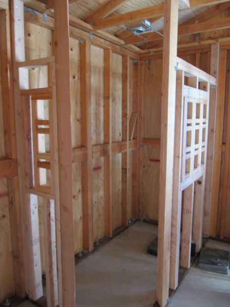 Las paredes de la ducha se ha enmarcado como cualquier otra pared con montantes de 2 "x 4", generalmente 16" en el centro y placas de soporte de presión-tratada (la madera que se encuentra en el piso). Durante las "tuberías" de la ducha y la bañera, extremos de la tubería de desagüe fueron cada uno dentro de cajas de plástico, así que cuando la losa se vierte un vacío fue creado que rodea el extremo de cada tubo de desagüe. Esta foto muestra las paredes de la ducha (construidas características de diseño como un espacio en la parte superior de las paredes y bloques de vidrio de "windows"). Las cajas de drenaje también son visibles, con uno dentro de las paredes de la ducha y el otro para el desagüe de la tina futura. Las cajas se debe recortarse exponer el drenaje tubos dentro.