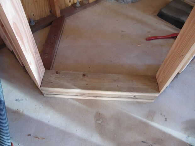 Un bordillo para regadera está construido con madera tratada a presión. La acera está atornillada en la losa con pernos de anclaje para hormigón ("cabezas rojas") y el tablero superior cubre los tornillos y tuercas.