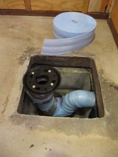 Aquí el cuadro ha sido cortar distancia y una trampa instalada que va a quedar por debajo de grado. También he puesto en su lugar el conjunto de dos piezas de desagüe (mi preferencia son Ebbe drenes para diseño y excelente atrapan el pelo). Pondré la altura por lo que es la parte más baja del drenaje (la pieza redonda en los pernos) aprox. 1/4"- 1/2" por encima de la losa. Entonces envuelto el tubo con el abrigo del tubo antes de llenar el espacio con concreto.