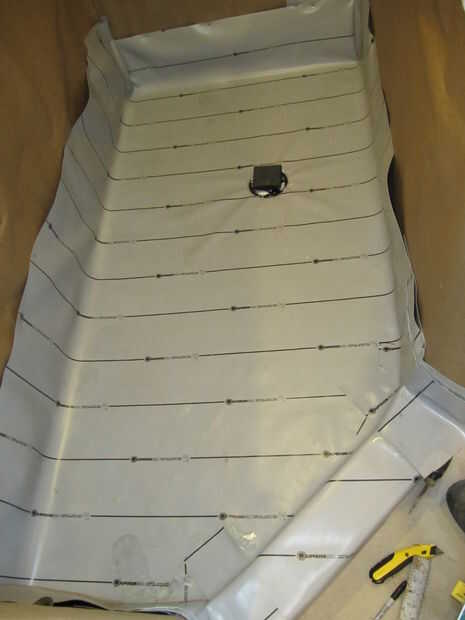 Hoja de vinilo hecha especialmente para cacerolas de la ducha está disponible de varios fabricantes. Las hojas son bastante gruesas, sobre 40 mil. y previamente hizo piezas para aceras, esquinas, etc. están a veces disponibles. El pegamento utilizado está específicamente diseñado para material de vinilo. En primer lugar, se separan las piezas de desagüe y el vinilo se coloca en la parte inferior de la cacerola. Pequeñas ranuras se cortan donde los pernos de drenaje sujetan las dos piezas de desagüe. Montar las dos piezas de desagüe, uno arriba y uno debajo del vinilo--y el tornillo junto. Cubra los agujeros de perno con silicona transparente antes de apretar las piezas juntos. El agujero de dren grande no se corta abierto todavía. NINGUNOS otros agujeros siempre se ponen en el vinilo dentro de la cacerola. Las esquinas se hacen doblando el material y clavó el doblez en la parte superior con un solo clavo. La acera se hace cortando y pegando trozos de vinilo con un montón de superposición y mucho pegamento. El pedazo de acera sólo está enclavado en la parte de atrás (fuera) de la acera.
