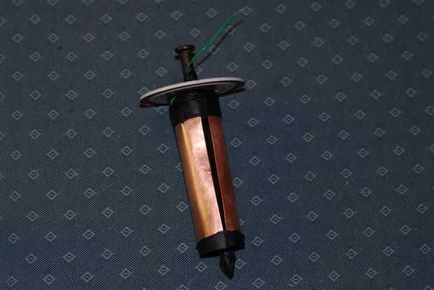 - Formar un pedazo de hoja de cobre en un cilindro alrededor del tapón de goma, así que hay una ligera apertura (como se ve en las fotos) todavía visibles a lo largo de la cara, ahora Envuelva la parte superior parte con cinta de goma y conecte el cable trenzado para el lado del cobre y luego Envuelva otra vez para sellar el cobre contra el tope, también poner una sola envoltura de cinta en la parte inferior para ayudar a mantener la forma cilíndrica ranurada
