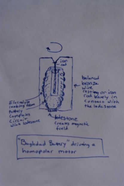 - Creo que hay una posibilidad que puede haber sido utilizada para ejecutar un motor homopolar. Los motores homopolar tienen un diseño muy simple, consistiendo en solamente una fuente de corriente (batería), una tira de cobre o bronce y un imán (por ejemplo magnetita) - todos los objetos accesibles. Un motor Homopolar fue realmente el primer motor eléctrico construido (por Faraday) - pero esto implicaría que Faraday era realmente tarde por varios cientos de años. Cobre y bronce estaban ya siendo manipulados en varias formas (como se ve en los artefactos) y magnetitas (rocas naturalmente magnetizadas) tenían probabilidades comunes y sagrado a la gente de este tiempo para su uso como ayuda a la navegación. No he podido encontrar fotos ni dibujos de los artefactos de bronce y hierro que se asemejaba a los cables (se hace referencia en las fuentes que se enumeran a continuación), mi argumento para un motor homopolar se extiende quizás, pero si los 'cables' están doblados correctamente puede apoyarlo. Un aspecto desconcertante de la discusión de la batería es la incertidumbre de cómo se accedía el electrodo de cobre para completar un circuito. Según las fuentes que se enumeran a continuación, la cerámica de estilo sasánida que los electrodos se suspendieron con el sello de asfalto/tapón fue porosa no esmaltados. Parte de mi razonamiento para cómo se completa un circuito con la batería, depende de una cáscara porosa que permite el filtrar en durante una carga en un estanque de electrolito y entonces el sudor hacia fuera durante la descarga del electrolito (tal vez completar un circuito con una magnetita colocado en la parte inferior de la maceta para conducir un motor homopolar, como se describe a continuación o algunos otros desconocidos). Si tuviera acceso al 'hilo' y otros artefactos encontrados cerca de las baterías, o las fotos de los sitios de excavación, etc. puede ser más fácil respaldar mis afirmaciones para un motor homopolar. Hasta entonces, estoy cierto estiramiento para explicar cómo las baterías fueron utilizadas realmente, basado en las piezas del rompecabezas limitado tengo disponible. motor homopolar simple video 1, 2