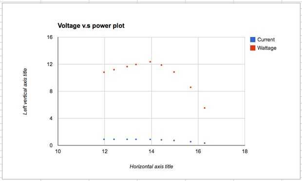 De la parcela de poder, parece que el punto de máxima potencia de este grupo particular es de 14V