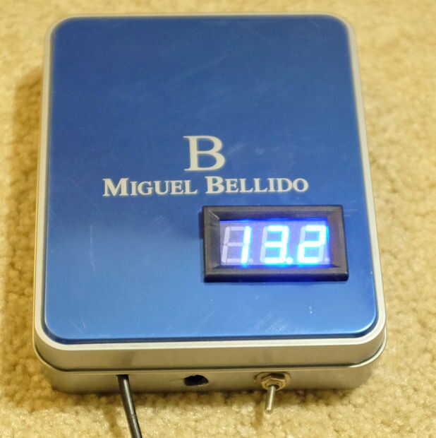 A encendido el medidor de voltaje de estante comprado de Amazon se agrega en la parte superior para permitir el uso monitorear el voltaje de la batería durante la carga y descarga.