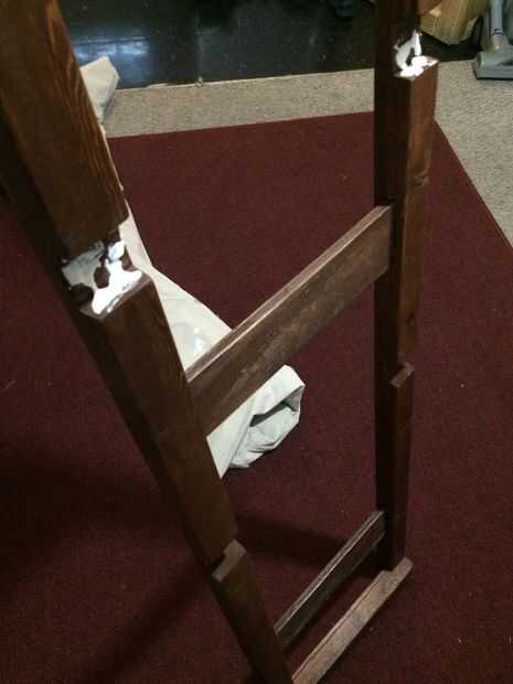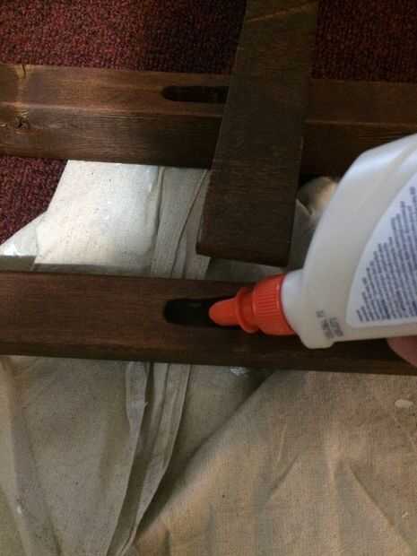 Con las piezas de la pierna, primero preparar los extremos de libro. Dejar caer pegamento en los surcos, poner los extremos de libro en. Agregue el pegamento a los lados opuestos de los extremos del libro y colocar la pierna enfrente del estante. Asegúrese de que las piernas son 14" aparte. Después de un tiempo de fraguado corto, puede Agregar pegamento en las ranuras de los soportes del estante. Coloque el estante soportes en las ranuras. Necesitaba pretaladrar los agujeros para el tornillo, desde el exterior de las patas de la plataforma. Tornillo del estante descansa de las patas principales. Debe montarse la plataforma exterior que incluye las piernas y soporte del estante.