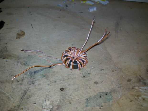 El transformador de la unidad de puerta hace exactamente lo que es nombre implica. Se toma la señal de la UCC y envía a los mosfets, así como aislar el lado de baja tensión desde el lado de alta tensión. Para hacer el transformador, en primer lugar, tomar sus tres pedazos de alambre y girar juntos. Esto crea una trifler de la bobina. A continuación, arrollar el hilo alrededor del toroide de ferrita 16 veces. (Cada vez que el alambre pasa a través del centro es una vuelta) después de eso, corte el alambre por lo que hay alrededor de 2 pulgadas a cada lado del transformador. Ahora, tomar dos extremos del cable del mismo color y cada uno a una salida de la sección de la unidad de la puerta de la soldadura. ******************************** filamento largo 2 pies de alambre (X3) Toroide de ferrita ********************************