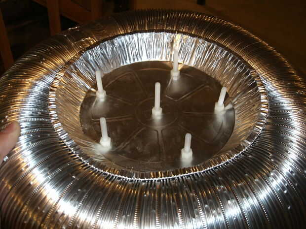 1. había doblado mi conducto secador de aluminio en un círculo alrededor de la parte inferior de uno de mis cacerolas de la empanada. Usted no quiere tener los huecos entre el tubo del secador y las cacerolas de la empanada, así que había doblado alrededor de la bandeja firmemente.