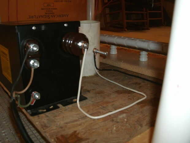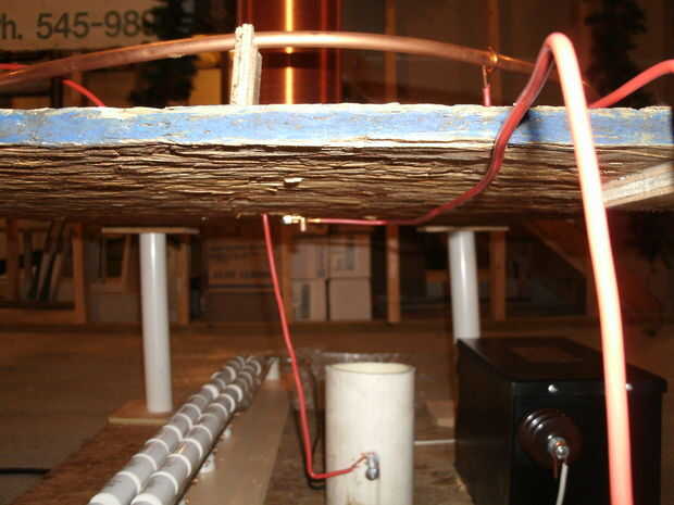 Usted se estará preguntando por qué tengo alambre de pollo enrollado hacia fuera por debajo de la base de mi bobina de Tesla. Este alambre de pollo sirve realmente como mi tierra. Si no tienes acceso a una tierra buena, o si no desea golpear una varilla de puesta a tierra en su patio trasero, use alambre de pollo. Funciona muy bien, nunca tuve un problema con él. Si utilizas este tipo de suelo, el alambre de pollo debe ser al menos 10 'x 10'. No pude encontrar un tamaño tan grande así que terminé usando dos rollos del mismo lado por side.*