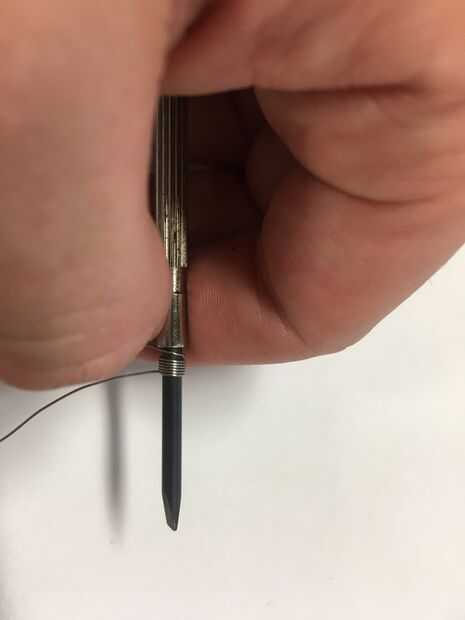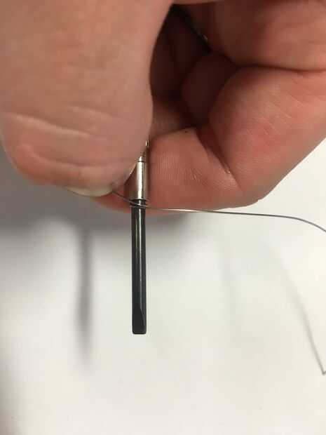 2. Con una mano sostenga el destornillador o broca (que coincide con el diámetro deseado de bobina introducido en el motor de vapor) así como uno de los extremos de la kanthal que previamente usted