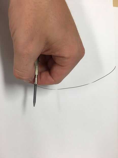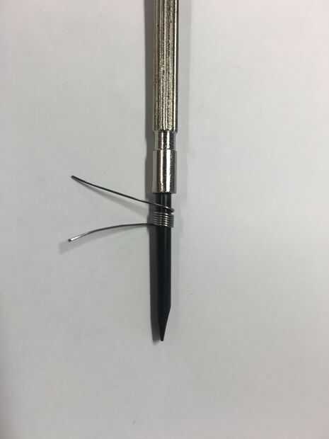 3. Con la otra mano empezar a envolver kanthal alrededor de su instrumento de envoltura. * Nota: 1 envoltura se completa cuando kanthal pasa por el punto de partida de la envoltura inicial.