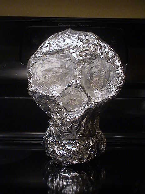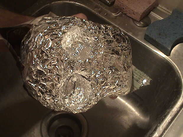 Básicamente lo que hice fue tomar un montón de papel de aluminio y había formado en la forma de una calavera. Esto será cubierto en papel machie y se utilizará como la base. Se centran en la parte superior del cráneo mucho más que la mandíbula. La mandíbula no es realmente importante en este paso. Hacer los zócalos del ojo más profundos que piensas que deben ser porque pondrá papel machie sobre esta forma de hoja de aluminio.