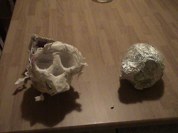 Papel machie cubierto cráneo ahora debe estar seco. Trace una línea vertical por el centro de la cabeza (si usted está buscando un perfil). Ahora toma un cuchillo creado y cortar a través de la máquina de papel a lo largo de la línea. Lo que está haciendo es cortar el papel machie de la Calavera de papel de aluminio y plástico de aluminio así que puede usar para hacer moldes más en el futuro. Comience en la parte superior del cráneo y cortar. Sólo corte suficiente para que usted será capaz de sacar la hoja de aluminio/plástico de papel machie. En mi experiencia, nunca he tenido un problema con el papel se pegan a la base del cráneo. El libro sería mucho más bien se adhieren a otro papel que para otro tipo de superficie con mi receta de pegamento de harina.
