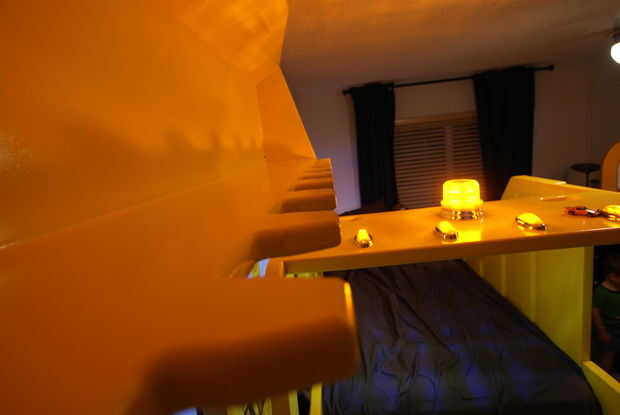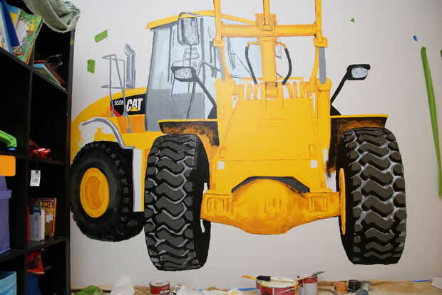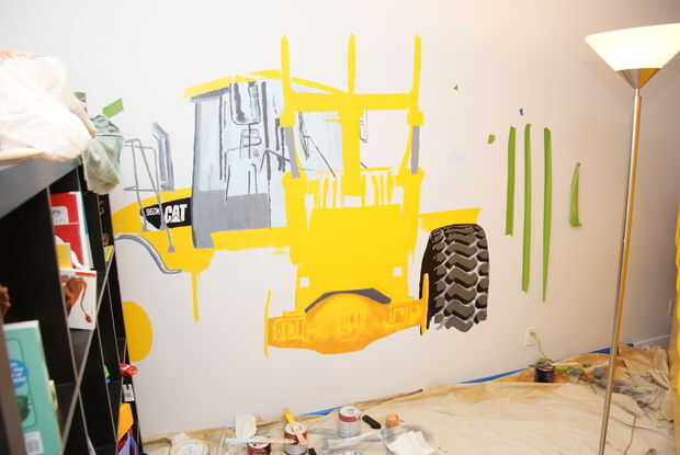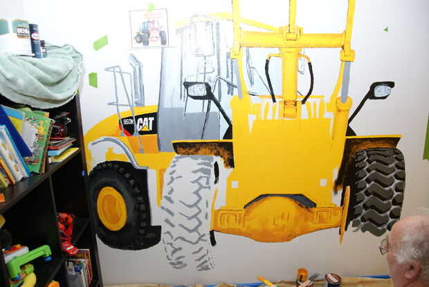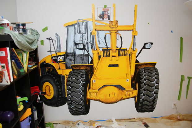 Aunque el cargador frontal no es un proyecto de madera es una parte integral de la estantería de madera funcional. Pintar un mural es bastante simple si engañas un poco como encontrar a alguien para ayudar a que se ha pintado un mural, mi papá en mi caso. Este es mi primer mural o pintura para el caso y resultó mejor de lo esperado. Primero bajé a mi distribuidor local de Caterpillar para tomar unas fotos y luego pidió prestado un proyector de un amigo. Me di cuenta del mejor lugar para el mural donde no estaba bloqueado por el camión. Cuarto de mi hijo es muy pequeño, tenía sólo unas pocas opciones. Inicialmente quería el cubo sobre el dumper pero pensé que mi hijo podría bonk su cabeza en el cubo. Así que colocado sobre la cabina como si el camión está rodando hacia adelante y el cargador está esperando a la suciedad de la descarga en el descargador. No descarga de la cabina. Mi papá hizo una pequeña tienda de fotografía para hacer las cosas derecho busca entonces su pintura por número. Pueden rastrear la imagen proyectada y la pintura o la pintura con el proyector en. Utilizamos la izquierda sobre la pintura de látex del camión. Esta manera podía pintar sobre si alguna vez puedo pagar otra casa.