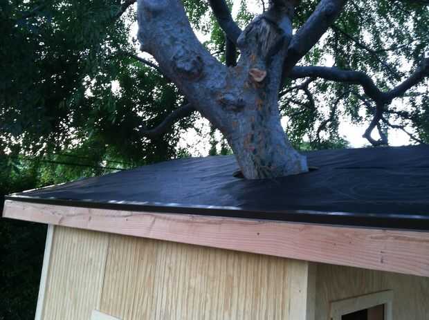 Para obtener el techo comenzó a determinar cuánto de una ladera que desee en su techo. Utilicé un 4:12 para el ascenso y la carrera y esto fue una buena pendiente para estar de pie mientras se hace las tejas. Blocklayer.com es un gran sitio web para calcular vigas del techo y salientes de aguilones. Una vez que la altura de las vigas del techo que puede poner la viga del techo del centro haciendo un soporte temporal para mantener en su lugar hasta llegar a las vigas. Cuando tus vigas son todos en colocar la madera para el techo un permiso un buen 2 y 1/2" espacio alrededor del árbol por lo que puede influir en el viento sin golpear el techo. Usé las tejas cortadas por la mitad para sellar alrededor del árbol y tejas el resto de la azotea como normal.
