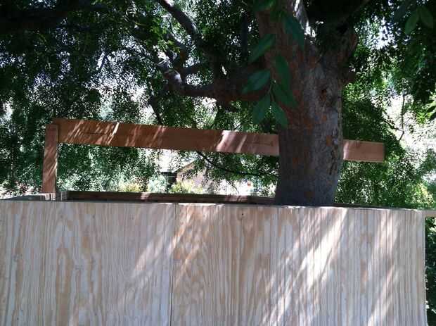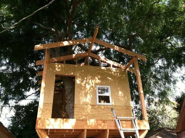 Este diseño requiere de dos o tres árboles (o ramas) en proximidad cercana. Se realizó a lo largo de varios fines de semana con madera nueva, tratada a presión para la estructura de soporte y el piso y una valla fue reciclada para los lados. El techo