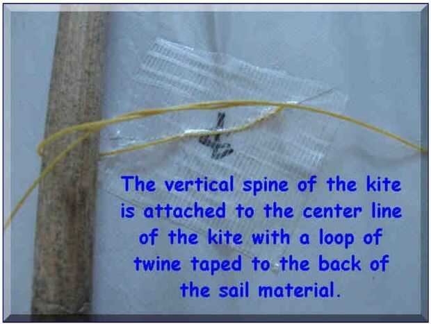 Si opta por construir una versión de desmontaje de la cometa puntero usando el conector de botella pop para los tallos dorsales, puede utilizar el siguiente método para fijar el tallo dorsal a la vela.