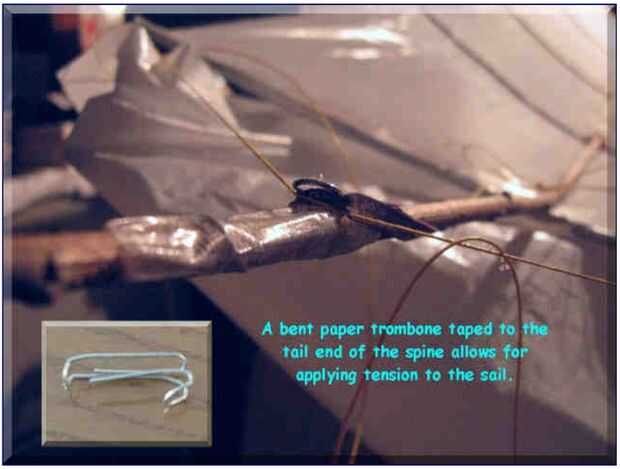 Para las líneas de tensión del borde de fuga, un método alternativo a un nudo es utilizar un trombone de papel y una goma rígida para mantener la tensión en la línea de ambos extremos del vástago del borde de fuga. Esto ayuda si usted ha utilizado hilo de algodón, que se extiende cuando húmedos o mojados, manteniendo la tensión en la vela, a pesar de la variable longitud de la línea de algodón.