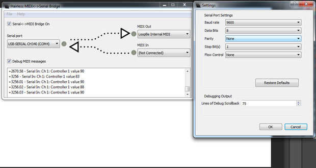Configure las opciones como se muestra con el Arduino en el puerto serie y LoopBe1 como su salida de midi.