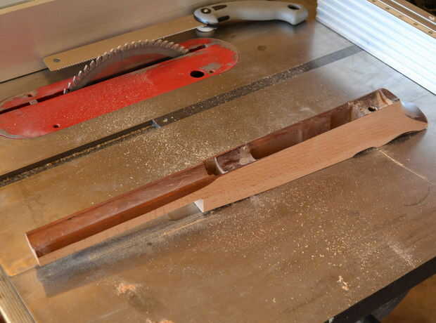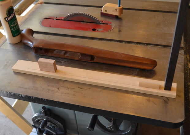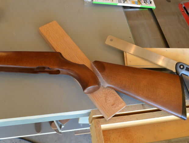 Construí un "trineo" para ayudar a mantener la acción orientada y bien sustentada como afeitado de los lados de las existencias originales. El trineo era indexado de la revista así y el canal de barril. Una vez que los lados se recortan distancia, corte las piezas de la culata y empuñadura que no necesitaba, dejándome con un stock bastante stumpy - y firmemente me empuja más allá de "el punto de No retorno"... ahora, yo estaba comprometida...