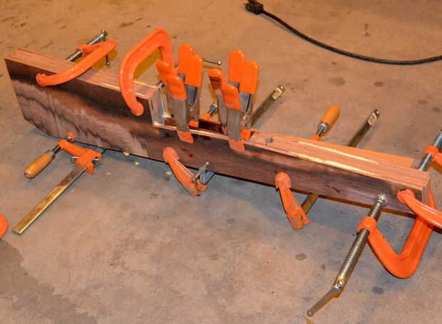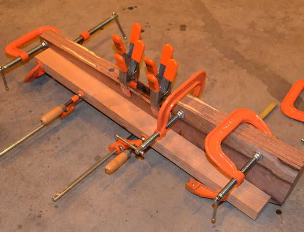 Una vez que la parte "central" se curó, cualquier vacíos se llenaron con una masilla de epoxy de 5 minutos de mezcla- y aserrín. Los lados fueron limpiados en una lijadora de banda una vez que se había curado del epoxi. Los paneles laterales estaban pegados en luego con pegamento de poliuretano - pero - estaba especialmente cuidado de detener la línea de pegamento justo pasando la zona de agarre ya que sabía que sería querer una culata más estrecho y peine. Por no pegar esta sección de los paneles a la base, pude más tarde sólo a través del espesor de los paneles exteriores en los lugares y pop de esas áreas de los lados de la zona de la culata. Seguro que venció tener que moler apagado unos 3/4" de material más adelante. Una vez que el pegamento se curó, squeeze-out fue quitado (con un cincel afilado), cualquier vacíos fueron llenados, y la forma áspera se limpió con una lijadora de banda (solo para tener un borde limpio para trabajar con).