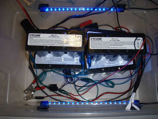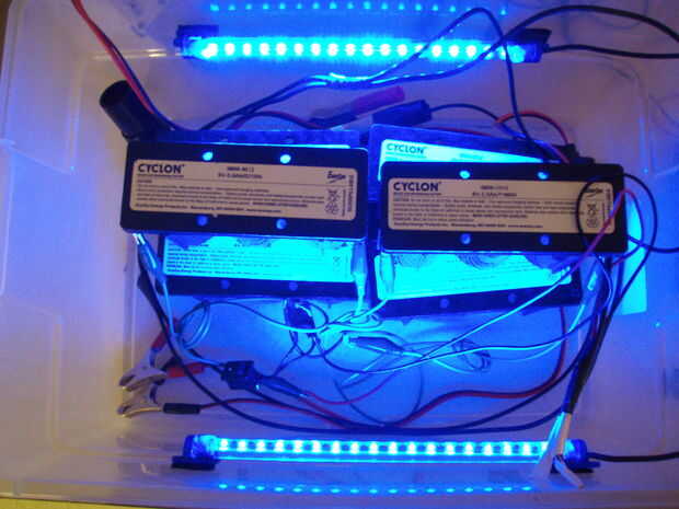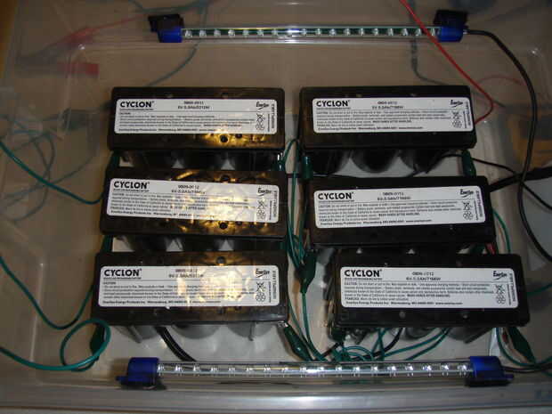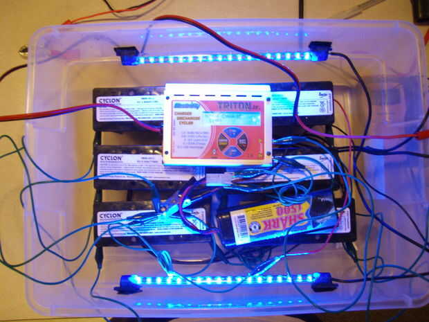 Una vez que hemos probado todos nuestros componentes, es el momento de ensamblar todo y prueba otra vez. es un poco dificil de ver pero las pilas se conectan en filas de positivas a negativa para hacer tres conjuntos de conjuntos de 12 voltios, entonces éstos están todos conectados para que tengamos una fuente de 12 voltios con una capacidad más grande. También he probado los cables de los tubos de LED y cargador nuevo. También hice una prueba de funcionamiento y cargado un 7.2v batería de células de 6