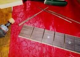 El tablero del traste del edificio se convirtió en una tarea mucho tiempo. Necesitaba tomar algunas decisiones antes de empezar. ¿Quiero comprar un pedazo en blanco de palo de rosa, cortar las ranuras y el radio de la superficie yo mismo o adquirir una tabla previamente ranurada con una radio? Me decidí a comprar. Por cierto el radio en la superficie se supone que facilitan la guitarra un poco jugar, por lo que un tablero del traste plana probablemente habría trabajado. ¿Segunda decisión, quería poner y encuadernación de borde en la Junta? Sí, creo que ve mejor, pero hace insertar el alambre de traste un poco más difícil. Tercera decisión, ha querido fijar el tablero del traste al cuello, antes o después de instalar los cables de traste. Escogí, porque quería utilizar mi taladro como una prensa de alambre de traste de McGuivered y necesito el tablero para ser plana.
