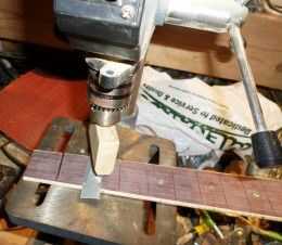 Hice una herramienta para usar en mi taladro para un método a la prensa en el alambre de traste. Era sólo una ¾" amplia pieza de desecho de ceniza con un ¼" tornillo en un corte lateral, cabeza apagado por supuesto. Marqué una curva de radio de 16 pulgadas en el pequeño pedazo de cenizas mediante el uso del radio 16" lijado bloque comprar de la fuente de Stewart-MacDonald Luthier. A continuación, utilizar el tambor de lijar poco para sacar la madera debajo de la línea. Para cada trozo de alambre de traste corte la longitud con una 1/8" a cada lado del tablero del traste. Luego con una amoladora dremel y un pequeño archivo quité la parte de púa en la parte inferior del alambre para que los bordes se ponen sobre el atascamiento de lado. Trabajando en 2 ranuras de traste en el tiempo utilizo un pequeño archivo cuadrado para dar a cada ranura un cartabón leve entonces golpea ligeramente el cable hacia abajo con un martillo y bloque de madera lo suficiente para mantener en su lugar. Terminé de presionar con mi taladro amañada. También se utiliza un pequeño trozo de aluminio intermitente entre la madera presionando la plantilla y el alambre de traste.