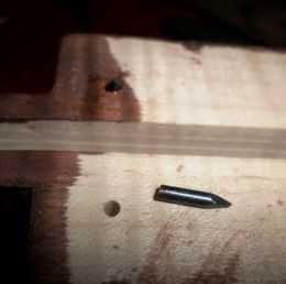 Solía "Fortsener poco ¼ para hacer alivio para el abulón traste puntos. Probado el ajuste del punto en una cavidad perforada hacia fuera primero, luego a taladrar cada agujero con mi taladro de columna a una profundidad que dejó un poco de los puntos que resaltan. Perforó, entonces había perforado más y probado probado, entonces más si es necesario para cada punto. Pegué los puntos en su lugar con pegamento. Utilicé el mismo método para los puntos secundarios excepto que utiliza una broca ordinaria y sólo estima la profundidad necesaria, luego lijar al ras una vez que el super pegamento conjunto.